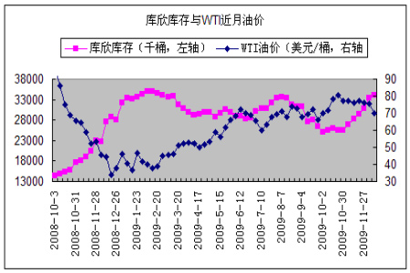 图为库欣库存与WTI近月油价走势图。(图片来源:光大期货)