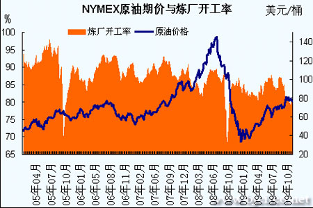 图为NYMEX原油期价与炼厂开工率走势图。(图片来源:北京中期)
