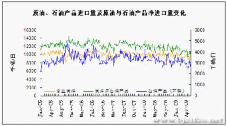 原油、石油产品进口量及原油与石油产品进口量变化图。(来源:北京中期)