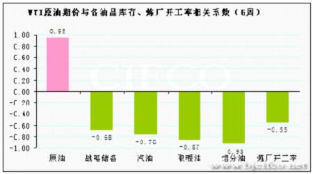 WTI原油期价与各油品库存、炼厂开工率相关系数走势图。(来源:北京中期)