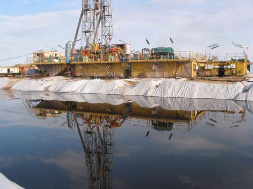 近几年,华北石油局五普钻井公司在大牛地气田积极推广天然高分子无固相环保钻井液体系,该钻井液体系性能稳定,不易发酵变质,即可对油气储层起到较好的保护作用,又不污染地面环境,是理想的钻井液体系。图为清澈的钻井液液面中倒影的蓝天白云。