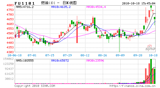 上海燃料油期货本周受外盘原油拉动,迅速攀升。主力1101合约本周开于4620元,收于4750元,累计上涨202元,交投区间介于4598-4800元,成交量为518330手,持仓量为93196手。