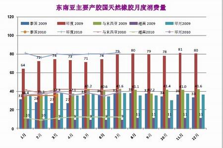 在ANRPC中,中国、印度和马来西亚三国的天然橡胶消费量是最大的,这三个国家的需求量之和占全球天然橡胶总需求量的45%左右。2010年的前四个月,这三国天然橡胶的进口量和消费量均出现了较大幅度的增长。2010年1至4月份,中国、印度和马来西亚三国天然橡胶消费量按年率计算分别同比增加了25.5%、11.7%、13.6%。