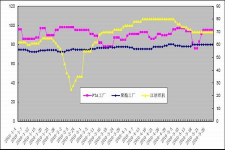 外围资本环境不断出现利空新政,国内调控房市的力度加大、澳大利亚再度加息,市场人士对希腊债务担忧挥之不去,欧美股市下跌,美元兑欧元汇率上升,原油期货从19 个月以来最高位回跌。受此拖累,国内股市及大宗商品期货市场展开了一波震荡向下的行情,现货市场同样遭遇重创,月累计下跌700 元/吨,幅度达8.7%。中石化及主要PTA 供应商5 月份结算在7800 元/吨,较4 月份结算下滑550 元/吨,6 月份挂牌价格在7800 元/吨,较5 月份结算持平。五一节后,中国人民银行决定自5 月10 日起,上调存款准备金率0.5 个百分点至17%,此举对大宗商品期货市场形成一定打压,现货市场承压,业内人士平淡观望,内外盘双双小幅下挫。此后市场基本维持下滑态势,截止5 月28 日,华东PTA 现货市场零星报盘意向在7350 元/吨,实盘意向大致7300 元/吨;外盘船货市场行情同样跟涨,台湾货及保税货报价875 美元/吨附近,韩国货源报盘855 美元/吨附近,实盘大致845-870 美元/吨,买家意向谨慎,实盘依然稀少。