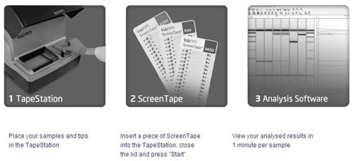 ScreenTape平台是一种快速、方便的自动化台式凝胶电泳解决方案,包括TapeStation台式电泳仪及ScreenTape以塑料为基础的消耗品、相关试剂。用户只需加载样品和ScreenTape消耗品到紧凑TapeStation仪器上,一分钟就可以得到蛋白质、RNA和DNA样品的分析结果。