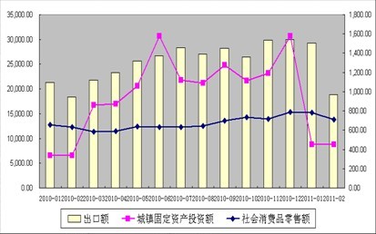 2、图1也可看出一年中的社会消费品售额3月份是最低的月份,主要是春节过度消费高峰过后,随后一个月将会出现大幅萎缩;在加上国内的CPI高企,尤其是食品价格已出现2位数的增长,这将大大抑制消费需求。笔者可以大胆的预计3月份社会消费品售额将出现较大回落;