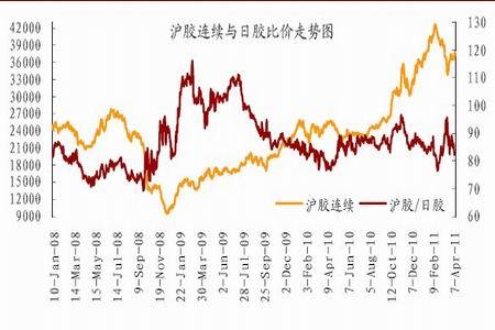 图为沪胶连续与日胶连续比价走势图。(图片来源:北京中期)
