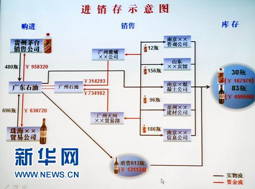 这是在新闻通报会上,中石化调查组向记者展示的“天价酒”进销存示意图(4月25日摄)。4月25日,中国石油化工集团公司分别在广东和北京两地向媒体通报了有关“天价酒”事件的调查和处理结果。中石化下属广东分公司总经理鲁广余因违纪被免去总经理职务,降职使用。同时,对鲁广余给予经济处罚,对已消费的 13.11万元红酒费用,由其个人承担。中石化油品销售事业部副主任夏于飞主持广东分公司的工作。新华社记者田建川摄