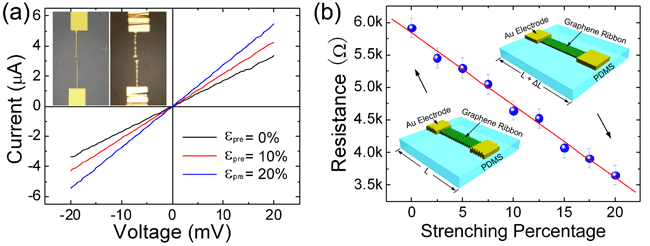 图2 (a) 周期折叠石墨烯应力传感器在不同加载应力下的I-V曲线。插入图是折叠前后的光学照片对照。带有两端电极的石墨烯条带整体转移到预加应力20%的PDMS衬底上,释放应力后得到了周期折叠石墨烯应力传感器。石墨烯条带折叠前的宽度是1.5μm,长度是22.8 μm。(b) 折叠的石墨烯应力传感器电阻随应力的变化关系。当应力从0变化到20%时,电阻从5.9 kΩ线性降低到3.6 kΩ。最小电阻3.6 kΩ为完全放松状态的石墨烯的电阻。对应应力传感器件的品质因子为-2。