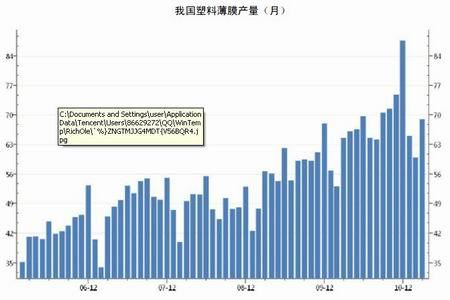 自2010年12月份,我国塑料薄膜产量达到87.6万吨的历史高位后,受春节假期影响,连续两个月下滑,2月份跌至了一年来低来59.9万吨,但是随着春节假期结束,工厂陆续开工,3月产量环比增加了13%,达到69万吨,受春季农用膜使用的高峰到来,预计4月份农用膜的产量将继续维持增加的态势,有望达到75-80万吨,由于目前市场下游需求持续低迷,产量的增加将对价格上涨起到制约作用。