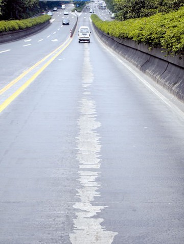 记者看到,“黑漆”脱落的地方,露出原有的水泥路面。有意思的是,“黑漆”脱落的地方,并不仅是汽车车轮经常驶过摩擦的车道两端,车道中央摩擦较少的地方也有。掉漆的路面,或呈块状,或呈条状,使该立交路面看起来很“斑驳”。