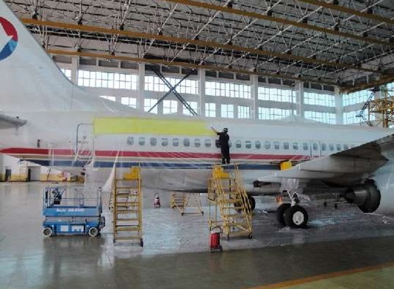6月22日,昆明维修基地定检维修部结构修理车间接到工作任务。本次喷涂任务要求在飞机的左、右侧整个机身进行涂装,喷涂面积很大,工作量非常大。喷涂新标志需将原有涂装去除后喷涂底色,再喷涂新的标识文字。进行大面积喷涂工作前,为了减少打磨粉尘造成的污染和不让喷涂用漆污染到不需喷涂的区域,需要将飞机不需喷涂的部位,以及在机库内进行定检工作的其它飞机进行保护性遮盖。为了不让喷漆工作影响到白天进行的飞机定检工作,喷涂工作大多是在夜间进行。外界的温度变化,夜间照明的局限都给喷涂工作带来很大难度。结构修理车间安排了专业工作人员,并组织优化了工作流程。另外,喷漆工作看似是一项简单的工作,实际上却需要相当的工作经验。喷涂的漆层的厚度、均匀程度等都会对喷涂的质量有很大的影响。负责此次喷涂任务的展国梁同志是一位有着多年喷漆经验的老师傅,他带领的团队经过连续几个日夜的紧张而细致的工作,将新的文字标识和鲜艳亮丽的绿色孔雀标志喷涂到了飞机上。