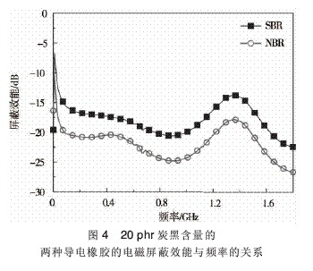 (3)导电橡胶在高频范围对电磁波的屏蔽作用以反射为主。随炭黑含量增大,复合材料的导电性能增强,对高频电磁波的反射作用增大,总的屏蔽效能增强。炭黑填充20phr时,丁苯导电橡胶在1.8GHz处的电磁屏蔽性能为-22.3dB,丁腈导电橡胶电磁屏蔽效能为-26.6dB。