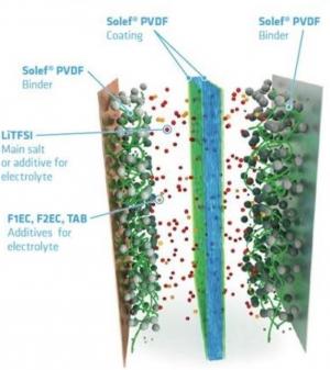 高性能索尔维材料用作锂离子电池的核心材料:PVDF电池隔膜涂层即便在高温下也能保持电池隔膜与电极间的涂层完好,同时粘接剂可确保在循环过程中电极完好无损。先进的电解质添加剂有助于延长电池的使用寿命、电容量及安全性。