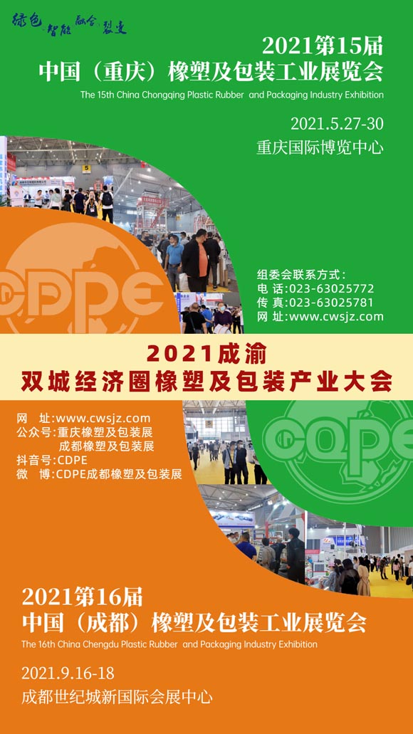为了更好的服务企业拓展西南市场,搭建供需双方交流平台,积极响应成渝双城经济圈政策。组委会将于2021年倾力举办成渝双城经济圈橡塑及包装产业博览会,分别于2021年5月27-30日在重庆国际博览中心召开CQPE第十五届中国(重庆)橡塑及包装工业展、2021年9月16-18日在成都世纪城新国际会展中心召开CDPE第十五届中国(成都)橡塑及包装工业展。