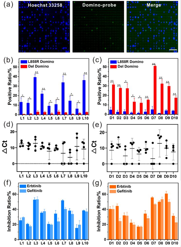 图3. 原代肿瘤细胞样品中EGFR RNA突变检测和耐药性分析。(a)纳米平台检测患者L1原代肿瘤细胞中EGFR L858R突变RNA的荧光图像。比例尺:100 μm。(b)和(c)采用纳米平台从具有EGFR L858R突变(b)或19外显子缺失突变(c)的原代肿瘤细胞样品中检测到的突变细胞阳性率。(d)和(e)分别对EGFR L858R突变(d)或19外显子缺失突变(e)的原代肿瘤细胞样品进行单细胞基因分析的qPCR结果。(f)和(g)EGFR突变靶向药物厄洛替尼和吉非替尼对EGFR L858R突变(f)或19外显子缺失突变(g)的原代肿瘤细胞的抑制作用。