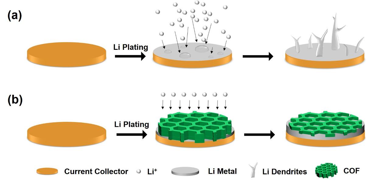 图4 COF抑制锂枝晶生长的机理示意图。(a)锂枝晶在铜箔上的生长;(b)COF引导均匀离子流实现均匀的锂沉积