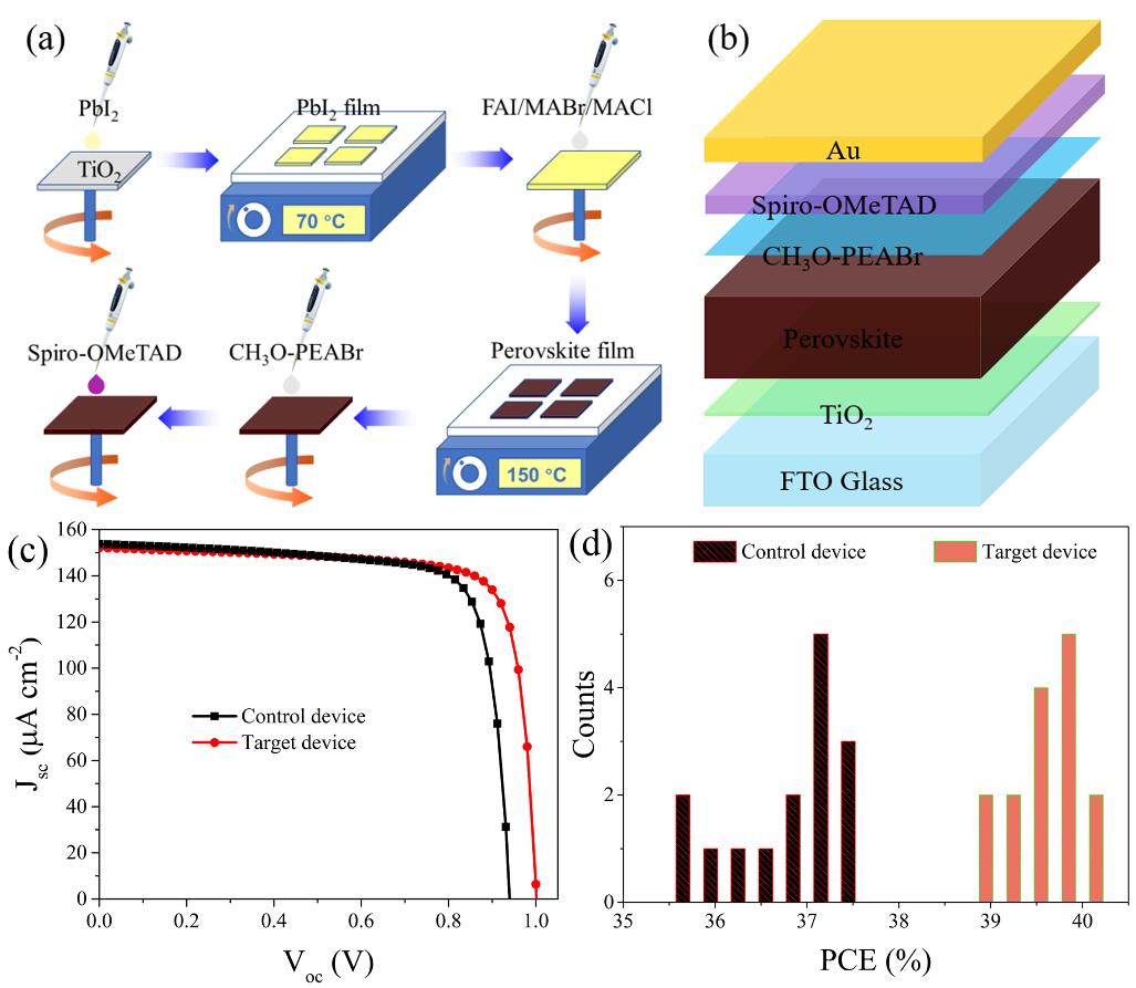 图1 (a)钙钛矿薄膜的制备过程,(b)平面钙钛矿电池器件结构图,(c)对照和目标器件的J-V曲线和(d)PCE分布图。