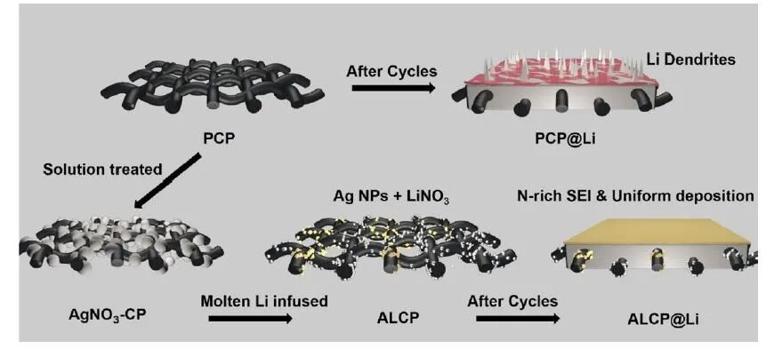 图1,ALCP@Li的作用机理以及与普通碳基金属锂负极(PCP@Li)对比。