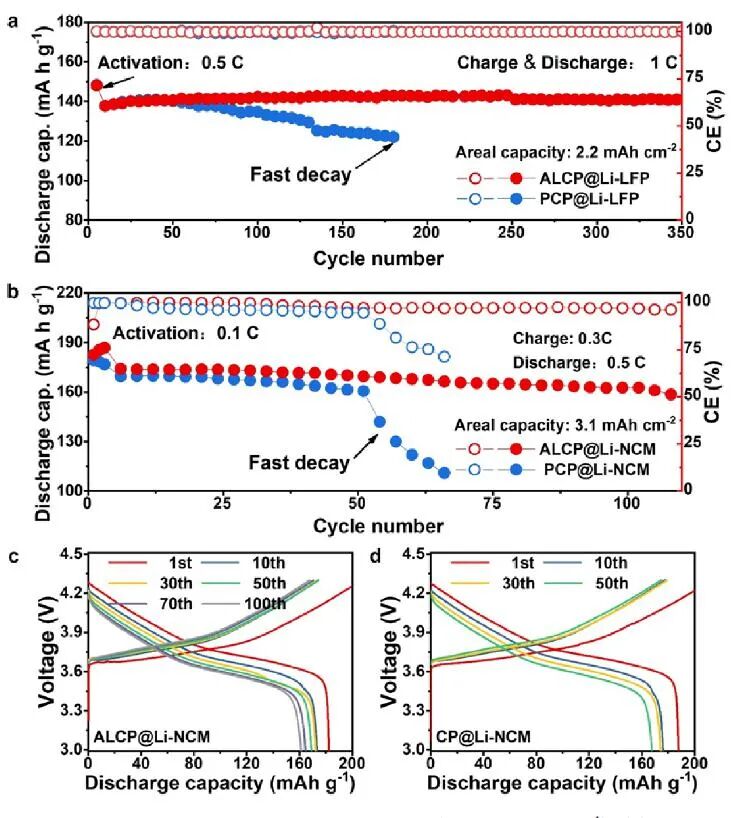 要点三:ALCP@Li与不同正极材料在不同载量下均可实现稳定循环