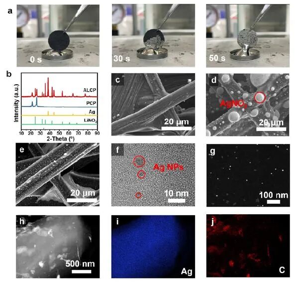 碳纸对金属锂的润湿性较差,在该工作中,硝酸银的引入极大地改善了这一点。如图2a所示,熔融态的金属锂在50 s内就浸润了整个碳纸,说明硝酸银溶液处理过的碳纸具有优异的亲锂性。通过XRD物相表征结果可以证明碳纸中已经生成了具有亲锂性的Ag与成膜剂LiNO3,与SEM、TEM等表征相结合,可以证实锂与硝酸银在高温下发生置换反应,生成了纳米级别的单质银,这是改善碳纸对金属锂润湿性的主要原因。