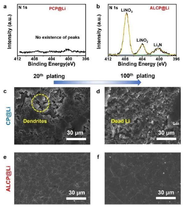 银纳米粒子可通过降低碳纸表面形核能(图3a)从而改善金属锂在碳纸中沉积方式,可观察到普通碳纸中金属锂与碳纸为分层式分布,而ALCP@Li中,金属锂与碳纸为整体存在。沉积方式的差异会直接影响到三维碳纸的利用率与金属锂的稳定循环性(图3b-c)。此外,银纳米粒子与硝酸锂的协同配合可以极大程度上提升半电池的库伦效率,如图3d-f所示,ALCP在不同条件下均具有极高的循环稳定性与循环库伦效率。硝酸锂对金属锂的作用主要体现在对SEI成分的影响上,通过XPS分析发现ALCP具有Li3N以及LixNOy等有利于SEI稳定的成分。因此,ALCP的沉积形貌较为平整光滑,有利于金属锂电池的稳定循环。