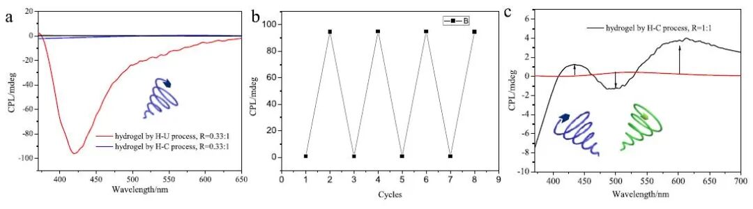 图3 a) 加热冷却和加热超声得到的Al(NO3)3/LysTPY (0.33:1) 水凝胶CPL光谱;b) 加热冷却和加热超声得到的水凝胶的CPL (419 nm) 强度循环图;c) 加热冷却得到的Al(NO3)3/LysTPY (1:1) 水凝胶CPL光谱。