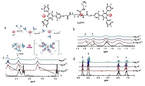图1 a) LysTPY结构式;b) 不同比例和不同刺激下Al3 /LysTPY配位机理和金属超分子聚集体结构示意图。