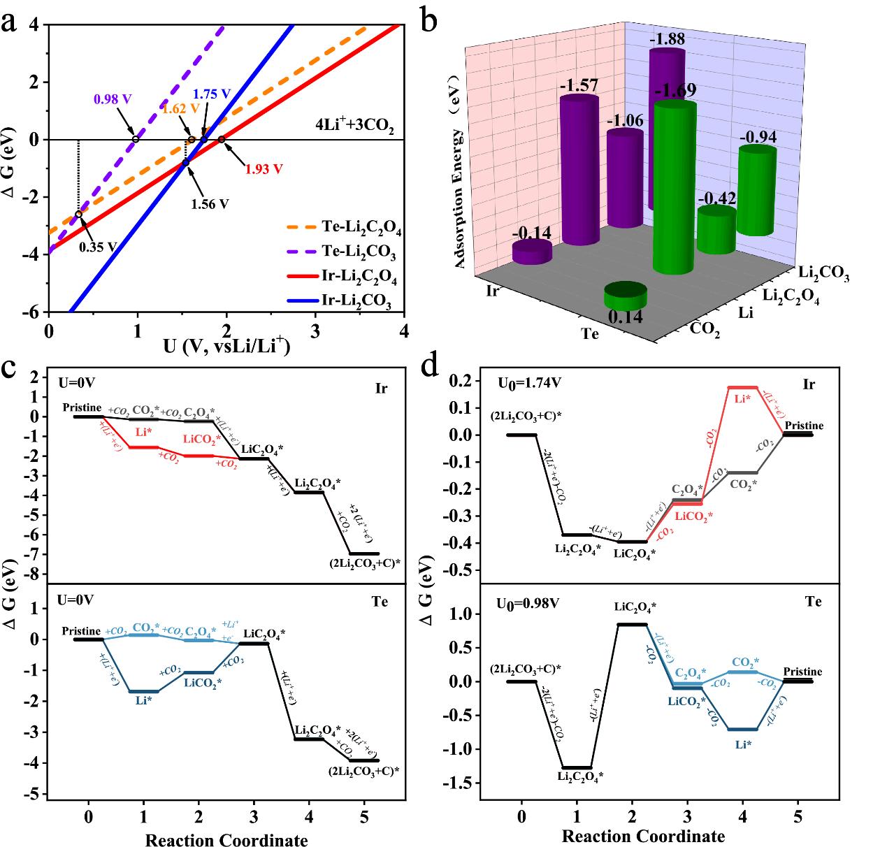 图5 (a) Ir(111)和Te(001)单分子层催化反应相图。 (b)吸附能对比图。 (c-d) CRR和CER在单层Ir或Te表面不同路径的自由能图。(c)零电极电位(U=0V)的CRR路径;(d)正电极电位(U=1.74V)的CER路径。