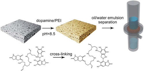 1.近年来,基于多巴胺的仿生表面改性受到了研究者们的关注。我们通过将低分子量的聚乙烯亚胺加入沉积溶液,对多巴胺改性聚丙烯微孔膜的方法进行改进。该法不仅缩短了沉积时间,提高了膜的亲水性与渗透性,由于共价作用的存在一方面破坏了溶液中的聚多巴胺颗粒的形成,减少堵孔的发生,同时膜的耐碱性也得到提高。最终该膜成功的用于常压下油水乳液的分离。相关论文“”被J. Mater. Chem. A录用发表。