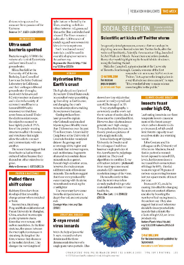 2015年3月12日,Nature 以“Pulled fibres shift colour”为题报道了彭慧胜课题组在拉伸变色高分子/碳纳米管复合纤维方面的研究工作,这是近2年Nature 第5次以“研究亮点”报道该课题组在智能纤维方向的研究成果。
