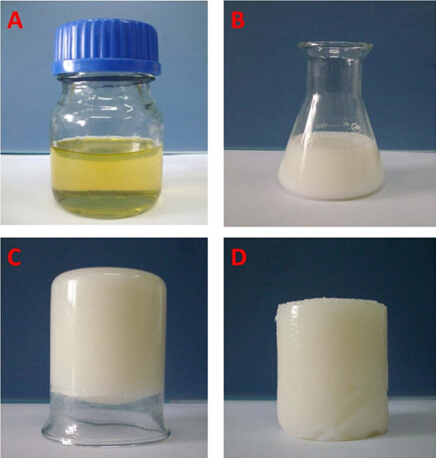 图1 单组份聚氨酯水凝胶水中乳化及凝胶图片。A:实验室合成的亲水性聚氨酯树脂;B:水中自乳化;C、D:与水反应后形成的水凝胶。