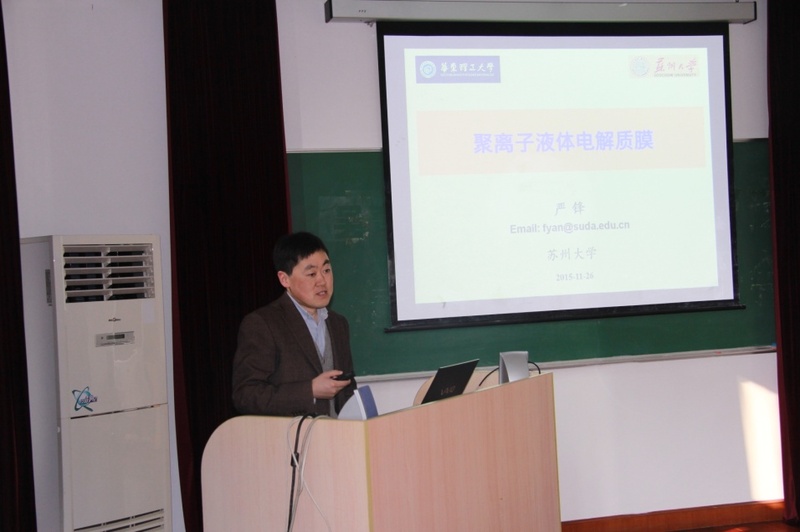 11月26日上午,应华东理工大学材料学院院长李春忠教授的邀请,国家杰出青年科学基金获得者、苏州大学严锋教授到访,并为该院师生作了题为“聚离子液体电解质膜”的学术报告。报告会由李永生教授主持。