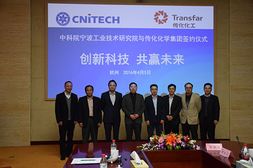 4月5日,中国科学院宁波材料技术与工程研究所与浙江传化化学集团在杭州签订了全面合作框架协议。宁波材料所副所长郑剑、所长助理朱锦,传化化学集团总裁周家海、集团研究院常务副院长王胜鹏、华洋公司总经理屈亚平,萧山科技局副局长汪新来等共同出席了签约仪式。签约仪式后,双方进行了项目对接交流。