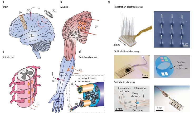 图6:将人工电子皮肤信号与神经系统相连的新兴技术与发展前景。a-d.人体中的潜在连接区域,包括大脑(a)、脊髓(b)、肌肉(c)和末梢神经(d),其连接方式包括电刺激(i),光刺激(ii)和磁刺激(iii)。插图:黑色虚线方框里的放大区域表示神经束中接受电刺激(i)和光刺激(ii)的少量或单根神经接口。e.顶图:刺激束中神经和神经内的电极排列。左图:穿透电极排列;右图:细胞内电极排列。中间图:光电诱导特异性活动的发光二极管阵列。左图:可伸缩的发光二极管;右图:多色彩的发光二极管阵列。底图:提供长期稳定生电接口的软电子元件。左图:软多功能电极阵列;右图:卡夫电路。