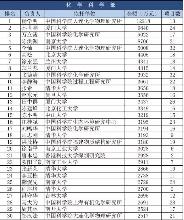自然科学基金30年经费排行Top100 化学及高分子相关Top50