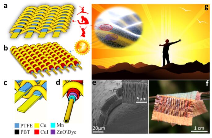 基于织物结构的(a)摩擦纳米发电机 (b)纤维太阳能电池,及其局部结构放大示意图 (c) 和 (d) 。 (e) 光电阳极的SEM图片。(f) 能源织物的实物光学照片。(f) 示意图展示,此种可穿戴的能源织物可以同时将人体运动的机械能和太阳能转化成电能。