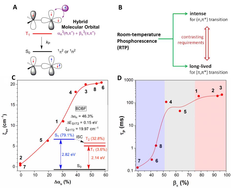 图1, A,三线态跃迁的分子轨道理论模型。B,RTP分子设计要素。C,不同分子结构的分子旋轨耦合常数(xSO)与分子三线态跃迁时 3(n, p*)所占比例 (an)变化量的关系。D,不同分子测得的实验寿命与理论计算的分子第一三线态中3(p, p*)所占比例(bp)的关系。