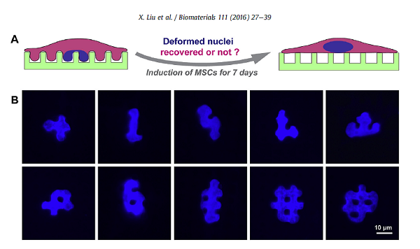 丁建东课题组近来还报道,细胞器的形状也可以成为一种影响因素。课题组前期采用微电子技术制备的模板获得了高分子材料的微柱阵列。在适当的微阵列尺度下观察到了细胞核的自我形变,这种细胞器的形变并不是细胞整体外形的缩影,具有相对独立性。随后的深入研究进一步发现,细胞核变形的半定量程度随微柱高度呈现类似一级相变的规律:这种细胞核变形即便在经过较长的干细胞诱导分化后依然得以保持。在细胞核的自我形变下,骨髓基质干细胞依然保持了成骨诱导和成脂诱导的潜能,但是分化程度则受到了细胞核形状的影响。这种影响与通常人们在没有显著细胞核变形的平整两维表面情况下的规律不一致,揭示了细胞核有较为强大的调控功能。