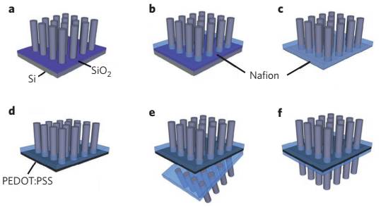 首先在Si基底上制备2套微米线阵列,沉积Nafion之后从基底上剥离,然后在其中1套微米线阵列底部沉积导电的PEDOT:PSS,最后将两套微米线阵列背对背联结在一起。
