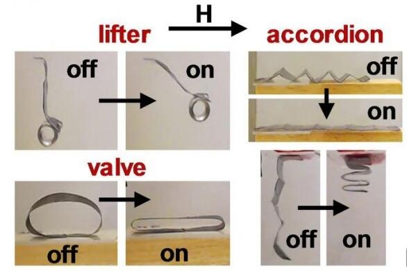 科学家们采用这种磁场操控的方法制造出了三种机器人。一个是可以承载其重量50倍的悬臂机器人(Lifter),第二种是可以像肌肉一样扩张和收缩的手风琴机器人(Accordion),第三种阀门机器人(Valve)可以通过挤压发挥泵的作用。