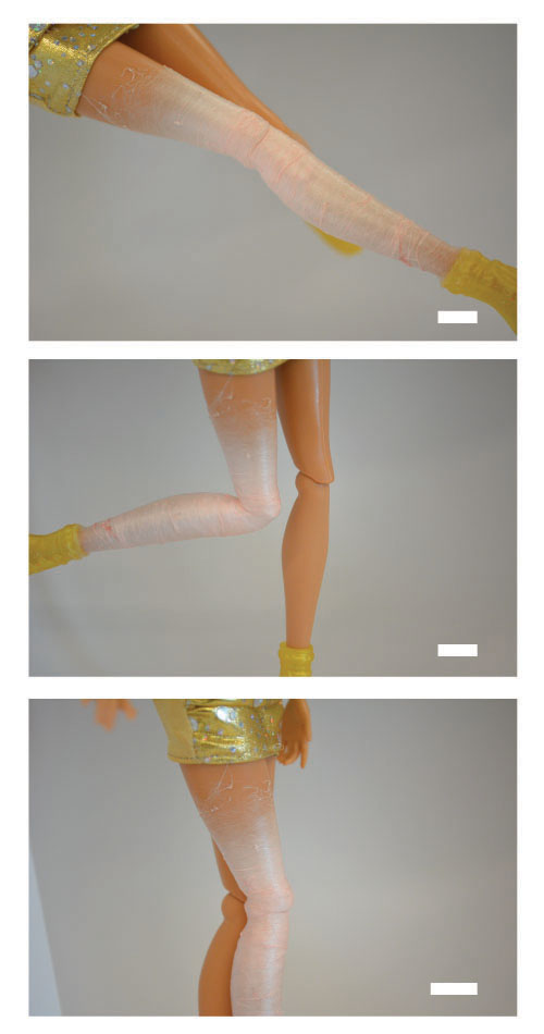 研究人员表明,穿着的服装可以使用拉伸纺丝设备制作。该团队将纤维网络直接应用于芭比娃娃的膝关节。目前这一应用仍处于概念性阶段,这只是该团队对于便携式纺丝应用的一点创想。
