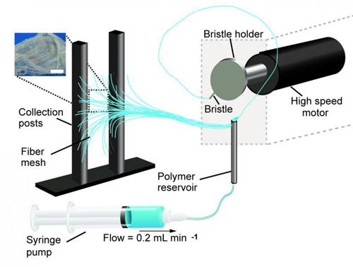 拉伸纺丝装置的示意图,展示了从聚合物储存器拉出的纤维。牵引纺纱系统由旋转的刷毛组成,其以螺旋轨迹倾斜并拉动聚合物射流。