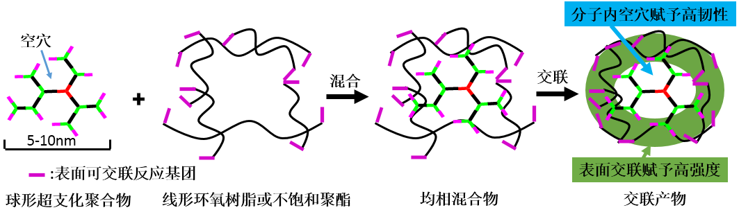分子尺寸为5-10纳米(图4)的似球形超支化环氧树脂很容易进入线形环氧树脂的分子链之间,似球形结构可使其在线形分子链间滑动,减少分子链间的相互缠结和相互作用,从而降低树脂的粘度,形成均相混合物。超支化环氧树脂表面的大量基团进行交联反应,形成高交联密度的界面层(图4中的绿色环)以提高强度,超支化环氧树脂内部不交联的分子空穴和似球形结构受冲击时可变形而吸收能量,提高韧性,因此超支化环氧树脂具有原位增强增韧功能。