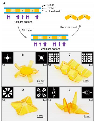 这一技术将明暗形状的灰度图投影到盘子上或者两块载玻片中间的液体丙烯酸盐聚合物薄层上。混入聚合物中的光引发剂材料受到寻常的LED投影灯的照射,启动交联反应,形成固态薄膜。聚合物浸染的光吸收剂起到光线调控作用。由于光固化过程中聚合物网络演变和体积收缩之间的复杂反应,聚合物中接受光线较少的区域更容易弯曲。