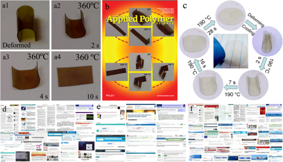 长寿命聚酰亚胺热缩膜在超过1000多次循环后依然保持接近100%的优异形状记忆效应,适应于循环驱动器等装置;能克服重力使形状回复,适合于失重状态的航天器等(Sci. Rep., 2016, 6:33610.)。Atlas of Science以“Long Cycle-Life Shape Memory Polyimide with Energy-Storage Capacity at High Temperature”为题报道,还有ADS/NASA、Pubfacts、Semantic Scholar、Docphin、Pubmed Central Canada、Gentaur、Europe PMC等国外报道;《化学通讯》、《军民两用技术与产品》、《润滑与密封》、《绝缘材料》等期刊,以及科学网、中国聚合物网、中国数字科技馆、中国塑料协会、中国塑协专家委员会等三十多家国内报道 (图1.f)。
