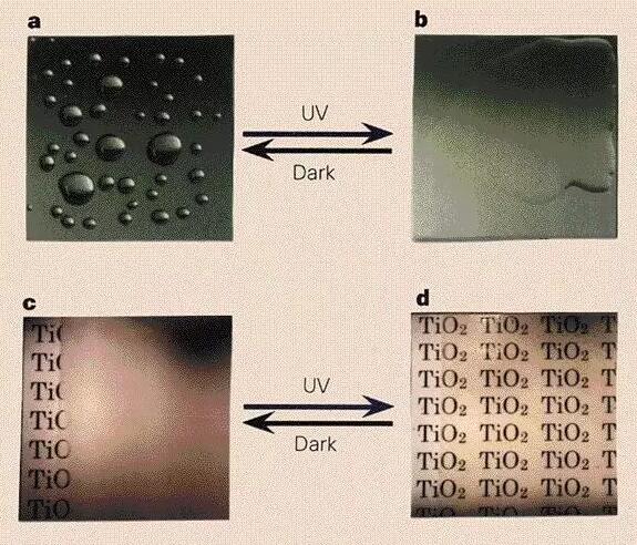 1997年,Wang,R等人利用TiO2的光催化性能在表面产生许多-OH,从而实现了超双亲TiO2表面。