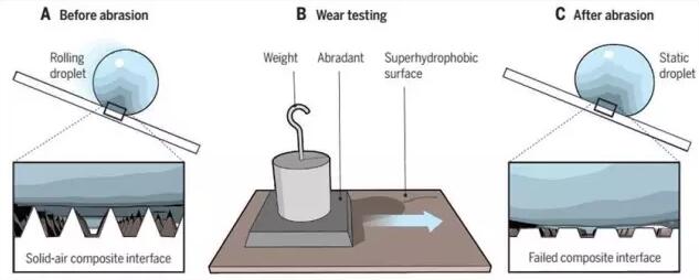 图11. 实际应用体系中,超疏水表面经过机械磨损前后的超疏水性变化
