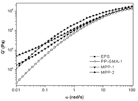 图1 熔体剪切实模量与角频率的关系