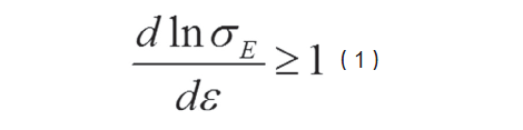 对聚合物熔体在不同剪切角频率下进行实模量与实黏度以及虚黏度的检测,频率越低,实模量却越高者熔体强度就越大(图1)。在熔体剪切虚黏度与实黏度的关系中(图2),所有线型聚合物的熔体都会形成一个圆弧状的所谓Cole-Cole 环,相反支链越长,枝化度越高者曲线越会反向上翘。虽然该判断有效、方便,只是尚不能回答该塑料“能否发泡?发泡的工艺?以及能发多大倍率?”等诸多关键问题。笔者等根据上述拉伸黏度以及应变硬化的概念,提出采用式(1) 进行判断的方法,满足式(1) 即可以发泡。